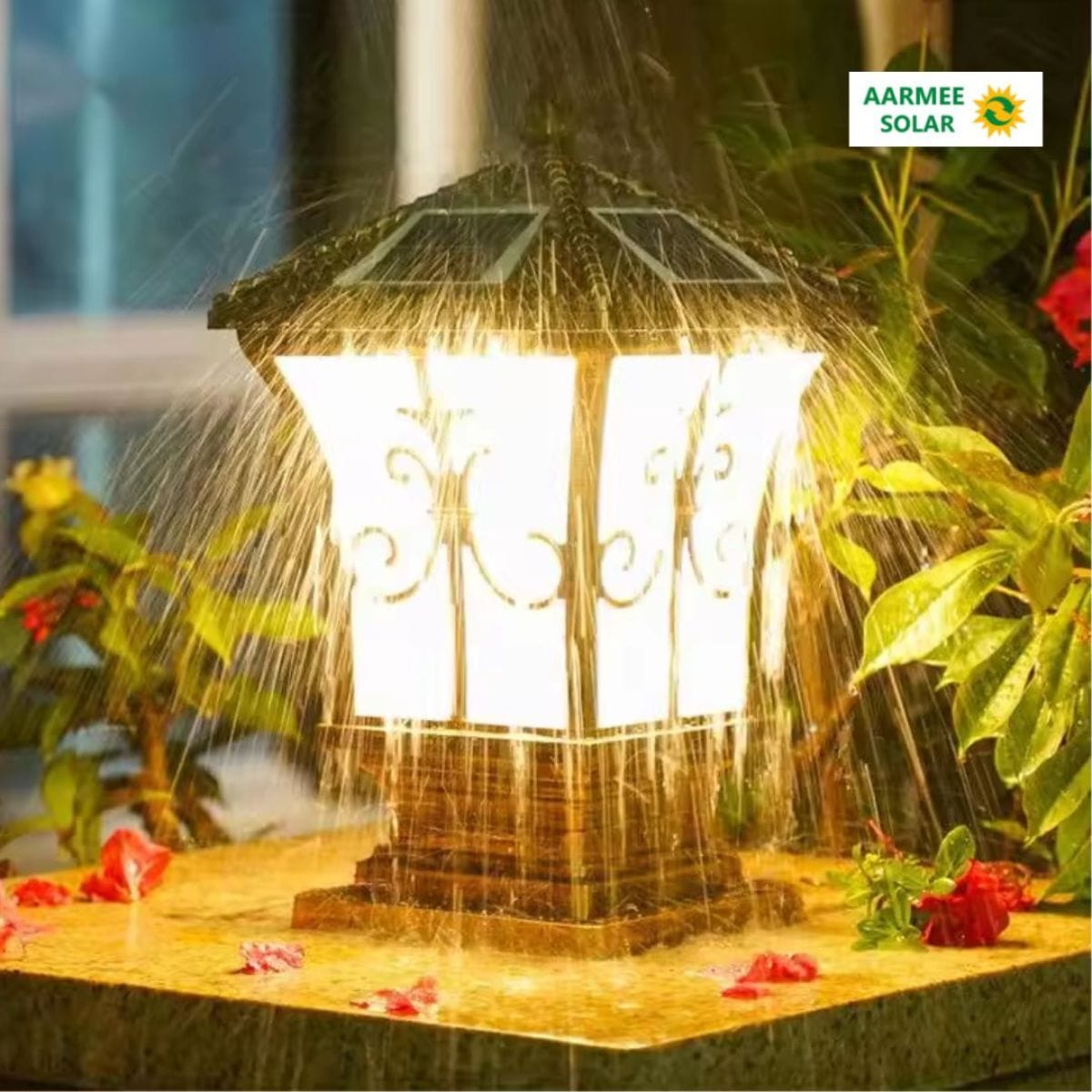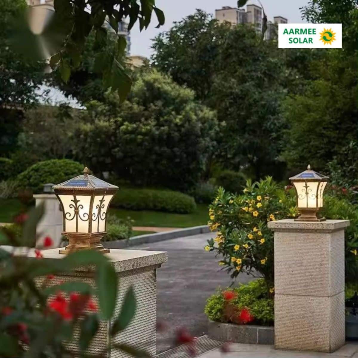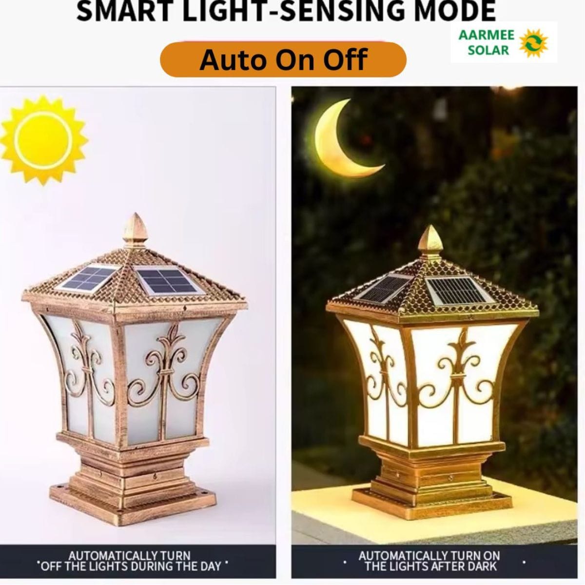 The Antique Solar Gate Light from Aarmee Solar is a premium solar-powered pillar lamp for gates and outdoor spaces. Built with an antique aluminium body, IP65 waterproof rating and remote-controlled 3 color modes, it delivers bright, aesthetic and electricity-free lighting.